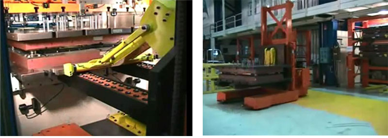 10吨及以下大重量模具、固定路线、非固定路线、地面比较平整环境的人工/无人转运作业,可以配合货架式仓储管理、自动转运、自动上下更换模具、柔性制造生产线自动上料等重工业柔性制造场合的模具更换与转运转运自动化作业。